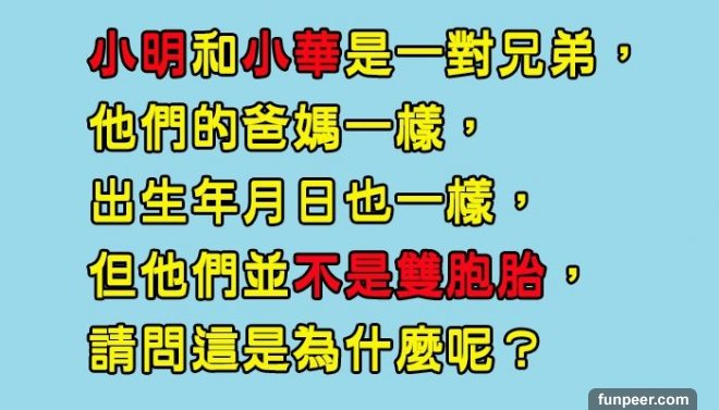 題目:A君和B君是一對兄弟,他們有同樣的父母和同樣的出生年月日,但他們卻不是雙胞胎,請問原因為何?