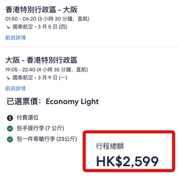 【大阪】唔止東京!又再平咗啲!國泰航空來回大阪連稅$2,599起!2026年1月至3月指定日子出發