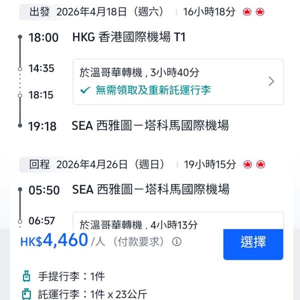 **可中停溫哥華,建議回程中停,來回連稅HK$4,806起**