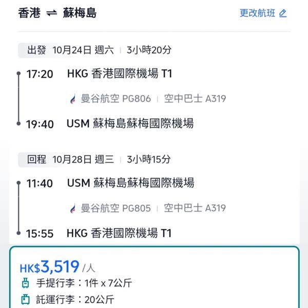 結論:想直飛蘇梅,真係得曼谷航空獨市,連個機場都係佢地私人興建並擁有,所以成本要靠機票收回!平時要四千以上,今次減到三千五左右,平過上次少少,仲要連暑假部分日子都有,出發日子去到下年1月都有,都幾抵玩,可以考慮入手!留意最抵價需用Mastercard付款,其他信用卡會貴少少。