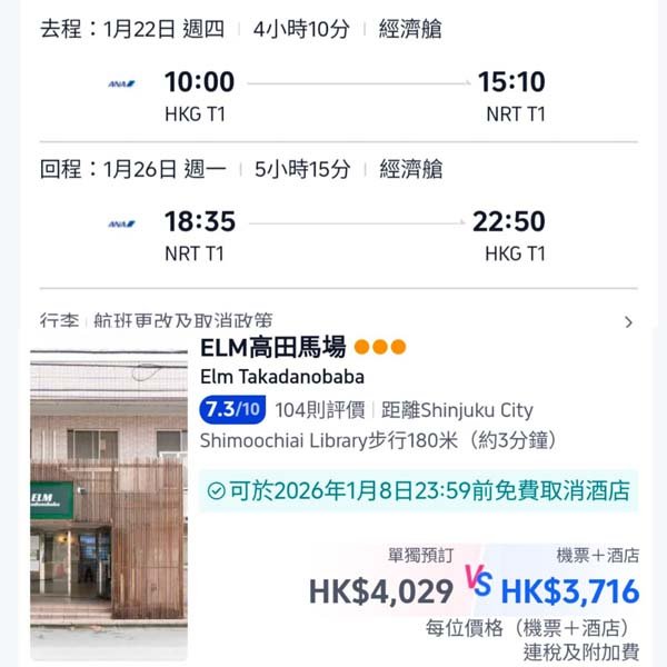 以2026年1月22日出發,1月26日回程(5日4夜)週末遊為例,包ANA來回機票+4晚酒店,每位連稅只係HK$3,716起(兩人一房計)!