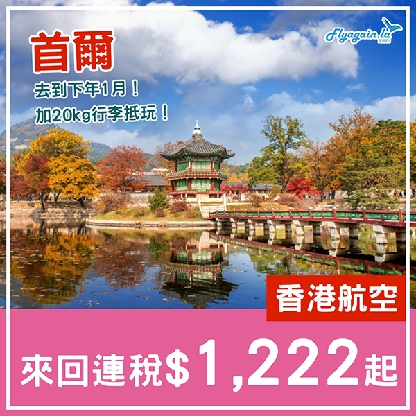 【首爾】遠期盤!香港航空來回連稅$1,222起,2025年1月21日前出發*