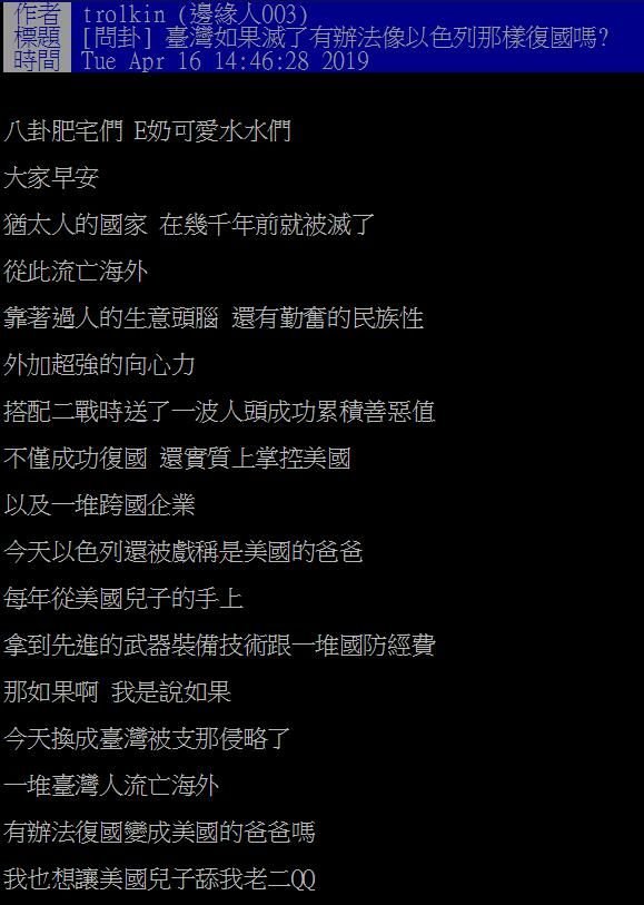 「臺灣如果滅了有辦法像以色列那樣復國嗎?」