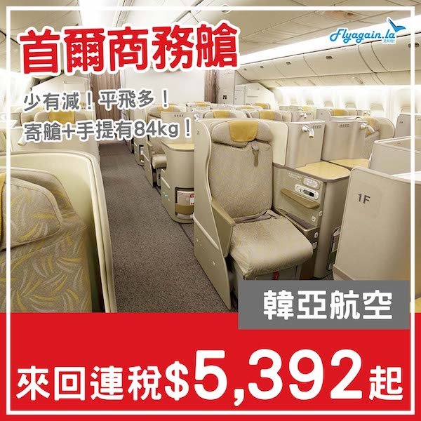 【首爾】商務少有減!包84kg行李!韓亞航空商務艙來回首爾,連稅$5,392起!6月30日或之前出發
