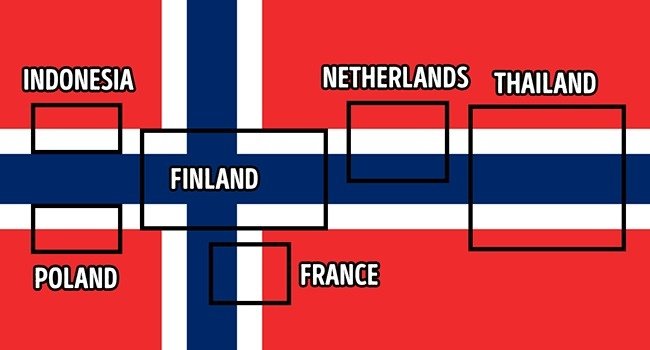 ▼36.可以從挪威國旗上找到其他6個國家的國旗,分別為荷蘭、泰國、法國、印尼、波蘭、芬蘭。
