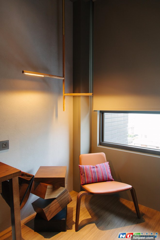 登記住房的5樓大廳很有趣,公關Edison說,Home Hotel設計圍繞著台灣原住民元素,大廳座位設計成如同營火晚會的現場,不僅有倒梯形的石桌模擬營火,更有石椅、漂流木或長得像石頭的椅子交錯在旁。櫃檯後方更用不同顏色的布幔,拼貼出宛如織布機的錯覺。