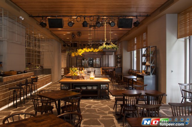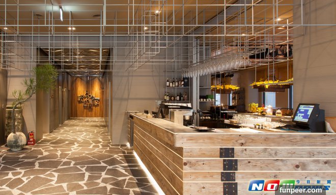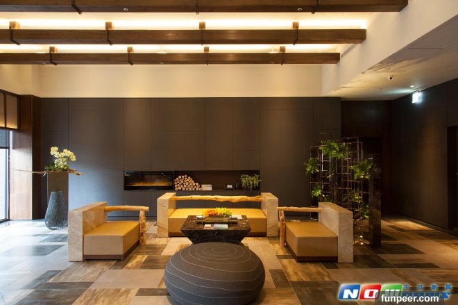 一樓大廳大量採用原木材質與大地色系,石材地板,創造宛如擁抱大自然、置身山林感覺,讓人不自覺的放鬆,感受如同回家的舒適感。這邊有個巧妙聰明的設計,為了配合大廳吧檯放置高腳杯,設計師將方形結構的鋼架,延伸超出吧檯的座位,成為踏入飯店的看到的第一個裝置藝術,將一樓原本挑高的空間,增加不同的視覺感官,也讓整體設計更為摩登現代。