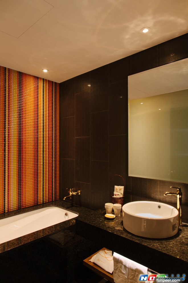 飯店的報到櫃檯設於5樓,電梯內部採用木頭材質環繞,此時如果閉上眼睛,更可聞到淡淡的香氣,這是高級飯店才有的特調香水,代表一間飯店的個性與品味。開門後映入眼簾是天然洞石搭配燈光,宛如星光閃閃的夜空,彷彿跟著星光走向回家的路。