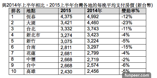 ▲2015上半年台灣各地的每晚平均支付房價。 更多NOWnews新聞都在行動APP上: 》》Android APP請點這裡下載 》》iOS APP請點這裡下載 》》大陸地區請點此直接下載APK安裝