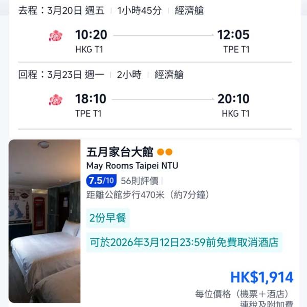 以2026年3月20日出發,3月23日回程(4日3夜)週末遊為例,包來回機票+3晚酒店,每位連稅只係HK$1,914起(兩人一房計)!