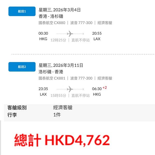 【洛杉磯】正!終於跌穿五千!國泰航空直航來回洛杉磯連稅$4,762起!2026年1月至3月指定日子出發