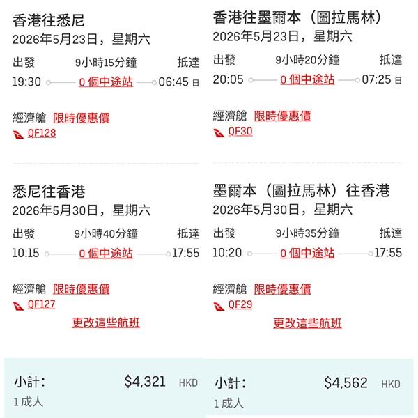結論:四千三左右就可以直航來回悉尼,直航墨爾本都係四千五左右,仲包30kg寄艙行李,多過國泰,呢口價幾唔錯!今次優惠出發日期仲遠至下年6月,有興趣去玩或者探親係機會入手!