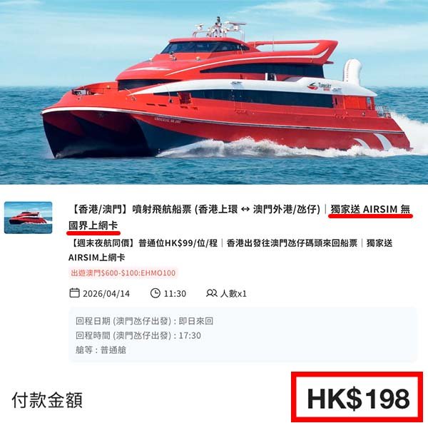 【澳門】送上網卡!最平唔使一百蚊一程!香港來回澳門船飛,每位連稅$198起!4月30日或之前出發