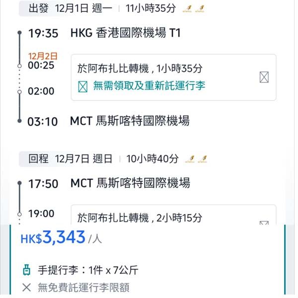 **大癲!如中停阿布札比,全程連稅唔包寄艙行李三千有找(價錢浮動,多介乎HK$2,819至HK$2,953),包埋就三千二左右,仲要再平咗!**