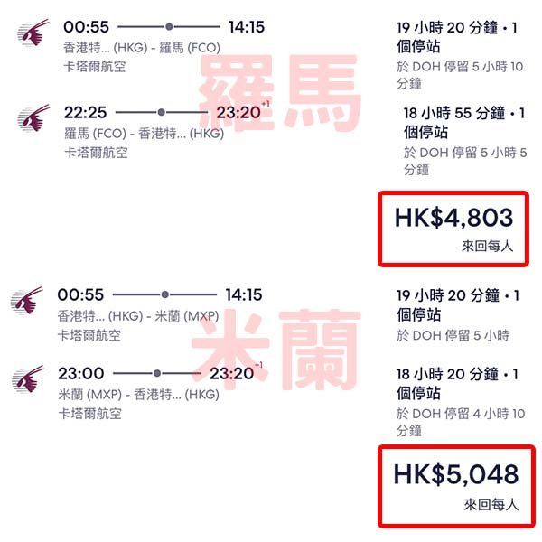 【意大利】抵飛歐洲!最平連稅五千有找!卡塔爾航空來回羅馬/米蘭連稅$4,803起!2月至6月指定日子出發*