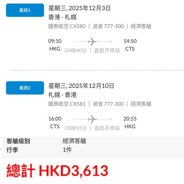 【札幌】直航北海道!繼續減價放平飛!國泰航空來回札幌連稅$3,613起!9月至12月指定日子出發