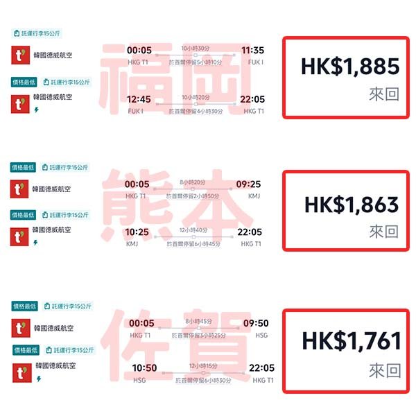 *因回程轉機時間較長,可中停玩埋首爾,請使用「多個目的地」功能搜尋。回程中停首爾,福岡連稅HK$2,291起、佐賀連稅HK$2,151起、熊本連稅HK$2,495起*