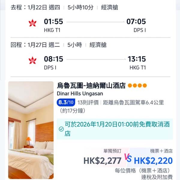 【峇里】平價度假之選!峇里島6日5夜套票,包來回機票+5晚酒店,每位連稅$2,220起!2026年1至3月指定日子出發