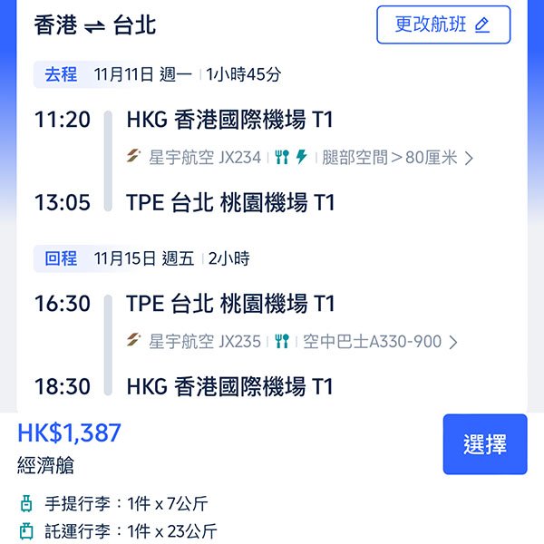 結論:星宇做咗差唔多一季,價位回落!冇計啦,台灣太多競爭對手,唔平真係難爭。Check過系統,呢口價到12月都有,出年就貴幾十,唔急嘅可以觀望下。Btw,CLS Holiday 10月搞高雄+台東校服團,有興趣埋嚟睇睇~詳情