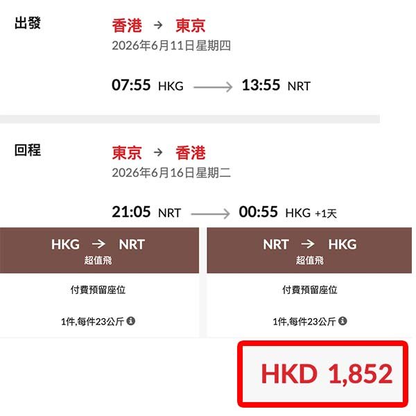 來回連稅價錢:HK$1,852起(下列括號內日子為HK$1,993起)