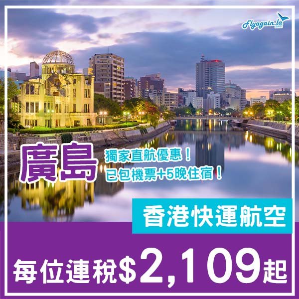 唯一直飛選擇,一人最平二千頭就可以去廣島玩6日,遊覽原爆遺址重、嚴島、兔島等,就算加埋寄艙行李都唔使三千,除開一日唔使五百,都值得入手!當然如果你唔想搭快運,可以選擇搭其他航空公司轉機前往,價錢都會相應調整~