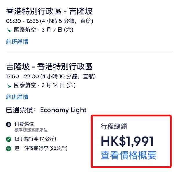 結論:加離境稅後,因為短途航線本身唔係貴,所以感覺上影響較大!國泰飛吉隆坡仲keep到二千有找都算幾唔錯,下年2至3月最多平飛,想去hea下食下好西,可以睇睇佢~