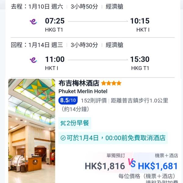 以2026年1月10日出發,1月14日回程(5日4夜)週末遊為例,包來回機票+4晚四星或以上酒店,每位連稅只係HK$1,681起(兩人一房計)!