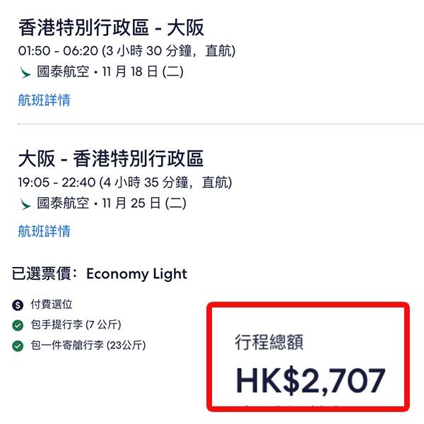 【大阪】多航班選擇!紅葉季仲有平!國泰航空來回大阪連稅$2,707起!10月至12月指定日子出發