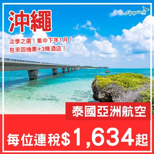 【沖繩】淡季遊沖繩!沖繩5日4夜套票,包來回機票+4晚住宿,每位連稅$1,634起!2026年1月至3月指定日子出發*