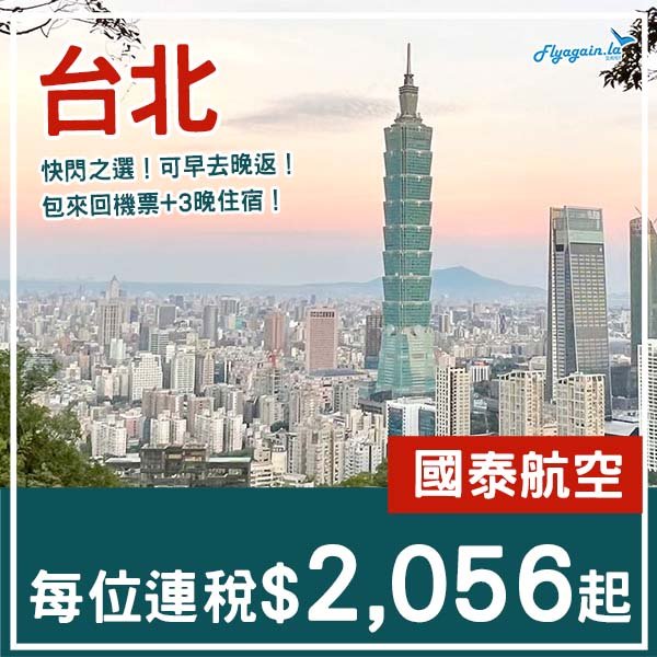 【台北】連五星酒店都唔貴!台北4日3夜套票,包國泰機票+3晚酒店,每位連稅$2,056起!11月至2026年1月指定日子出發