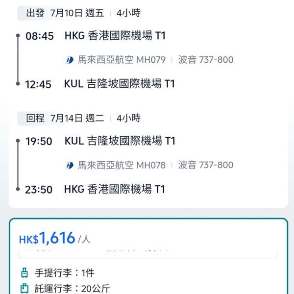 來回連稅價:HK$1,616起