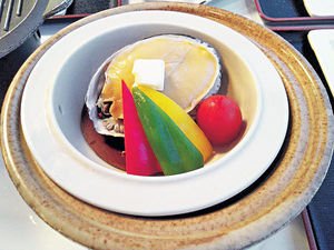 【第3站】鮑魚是原隻上,A4和牛需要自己用陶板燒,食材新鮮,原汁原味。