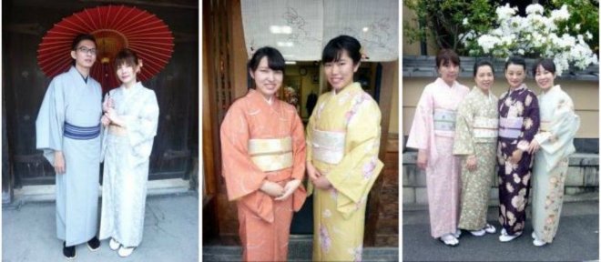岡本是很多遊客租借和服的選擇,分有3,000、4,000、5,000日圓(未連稅)套裝,5,000日圓(未連稅)套裝更有 600 套可選,男士則劃一4,000日圓(未連稅)套裝。髮型設計收費500日圓(未連稅),可以搭配髮飾,沒有化妝服務。可隔天歸還衣服,但需支付按金10,000日圓,另外亦可將租借的和服歸還至下榻的京都市內酒店,但要收費 2,000 日圓(未連稅/每人)。