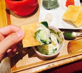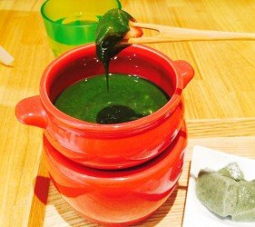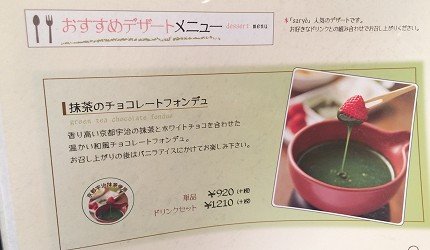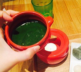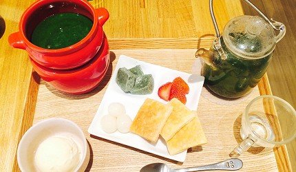抹茶巧克力鍋是到茶鍋必點的招牌甜點!甜而不膩的白巧克力作為基底,加上香濃的抹茶,配料有草莓、白玉糰子、酥皮餅、香草冰淇淋等。除了可以沾著抹茶巧克力吃,還能夠把抹茶巧克力加入冰淇淋中,甚是美味,這道招牌可是擄獲了許多東京少女的心呢!額外加價290日圓就能任選飲品,編輯部特別推薦「八女茶」,清香甘醇,搭配抹茶巧克力鍋最適合了。