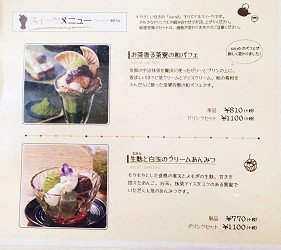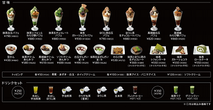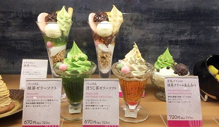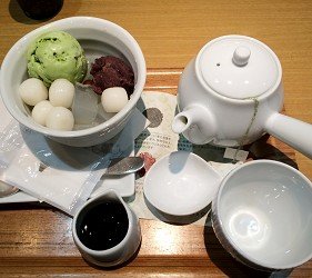 除了抹茶口味,「焙茶」系列也很不錯,跟朋友一起來可以各點一種。對於不吃冰品的客人們,這裡還有蛋糕以及熱的甜品甜湯等可以選擇,點一份甜點只要再加上250日圓或350日圓即可選擇一杯下午茶套餐飲品,逛街走累了到這裡休息補充熱量跟水分最好不過了!
