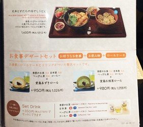 「cafe solare Tsumugi 紬」的套餐選擇非常多,從日式餐點、和風義大利麵到丼飯搭配烏龍麵等,再加上350日圓就變成附飲品的套餐,想要嚐嚐堂島蛋糕捲的人則可以餐點加上950或980日圓,就能升級成有飲品和蛋糕捲的超值套餐。