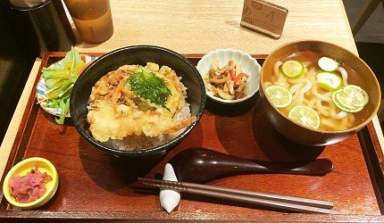 天丼和檸香冷烏龍麵。右上角的木頭數字小牌子是桌號,結帳拿那個去櫃檯就可以了,帳單是放在櫃檯。