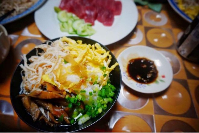 「雞飯keihann」就是奄美的特色蓋飯。食材其實很簡單,就是雞肉絲,雞蛋皮,香菇,還有自家醃菜等。作法就按照自己個人的喜好,將剛剛那些材料堆在熱騰騰剛出爐的白飯上,最後淋上熬好的高湯就完成了。