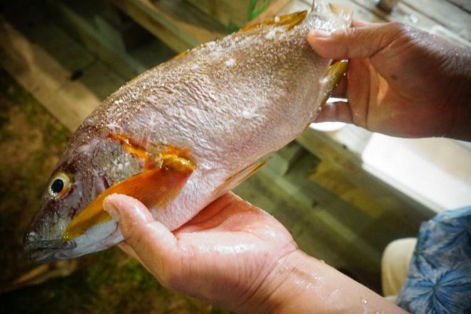 民宿主人為我們準備了許多當地的食材,晚餐就用那些食材來烤BBQ吧! 附近居民與民宿中其他客人,聽說來了一群東京的大學生,都熱情的一起參加了晚餐的BBQ。 其中有一對夫妻是在東京開餐廳,經常前來島上找尋食材,他們特地送了兩條魚為我們加菜。我們將魚裹上錫箔紙,撒上海鹽,再將其烤熟,沒有比簡單的調味更能展現出食材的美味了!