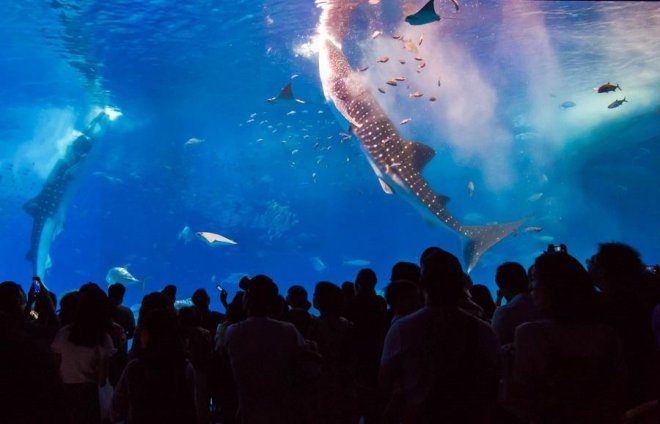 「沖繩美麗海水族館」是沖繩的人氣景點,每年都會有超過340萬人次入場。水族館規模非常大,能看到鯨鯊和蝠魟在水中悠游。