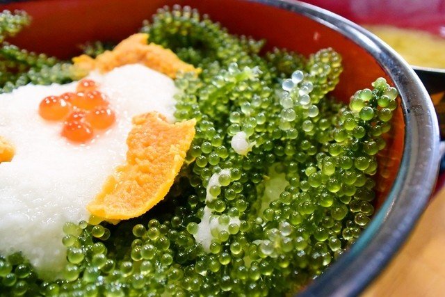 海葡萄是沖繩特有的藻類,在所有沖繩名產裡人氣排行前五,通常會與各式海鮮一起上桌,像是鮪魚、章魚、花枝、鯖魚、海膽、鮭魚卵、甜蝦等等,最後一定要配上高麗菜絲與伍塔斯醬,是很多人來到沖繩必吃的美食!
