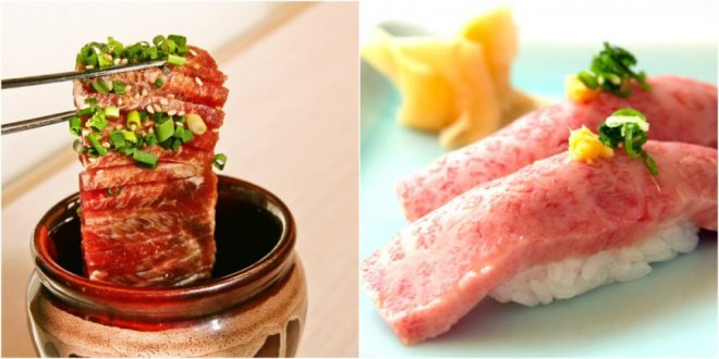 ▲ (左圖) 「壺漬五花牛肉」,用大蒜醬油特製的醬汁醃製,肉身長度約20cm,相當驚喜!(右圖)店內超高人氣的「霜降和牛壽司」!